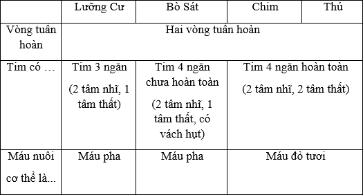 So sánh hệ tuần hoàn của Lưỡng Cư, Bò Sát, Chim, Thú?