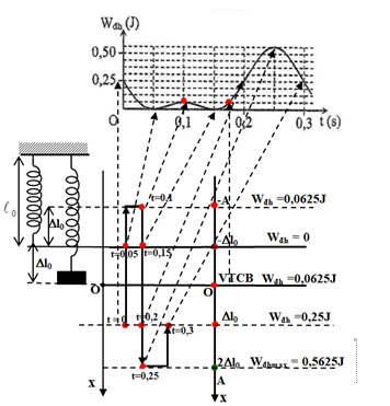 {W_{dh}} = \frac{1}{2}k{(\Delta {{\text{l}}_0})^2} = \frac{1}{2}(k.\Delta {{\text{l}}_0}).\Delta {{\text{l}}_0} = \frac{1}{2}m.g.\Delta {{\text{l}}_0} = 0,0625\,\,\left( J \right) \hfill \\