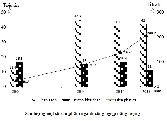 Theo biểu đồ, nhận xét nào sau đây đúng về sản lượng của một số sản phẩm ngành công nghiệp năng lượng giai đoạn 2000 - 2018?