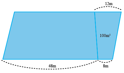 Một thửa ruộng hình thang có đáy lớn 48m, đáy bé bằng 75% đáy lớn. Nếu tăng đáy bé thêm 12m, đáy lớn thêm 8m thì diện tích tăng thêm \(100{m^2}.\) Tính diện tích thửa ruộng đó.