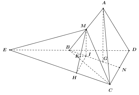 Cho tứ diện đều \(ABCD\) có tất cả các cạnh bằng \(a\). Gọi \(M,\,\,N\) lần lượt là trung điểm của \(AB,\,\,CD\). Tính khoảng cách giữa hai đường thẳng \(BN,\,\,CM\).