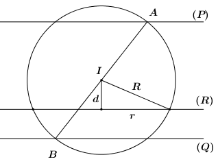 - Giả sử mặt cầu đường kính \(AB\) cắt \(\left( R \right)\) theo một đường tròn \(\left( C \right)\), gọi \(r\) là bán kính của đường tròn đó. Gọi \(R\) là bán kính mặt cầu đường kính \(AB\) và \(d = d\left( {I;\left( R \right)} \right)\), áp dụng định lí Pytago: \({r^2} = {R^2} - {d^2}\).