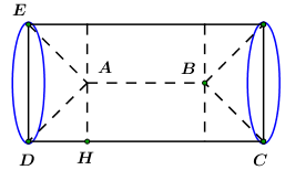 Khi quay hình thang cân \(ABCD\) quanh đáy nhỏ \(AB\) ta được khối trụ có chiều cao \(DC\) và bán kính đáy \(AH\) trừ đi hai khối nón ở hai đầu có có chiều cao \(DH\) và bán kính đáy bằng bán kính đáy của hình trụ.
