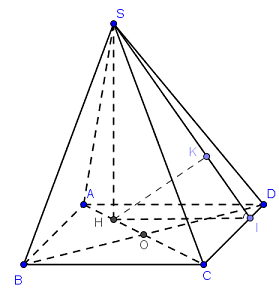 Cho hình chóp \(S.ABCD\) có đáy \(ABCD\) là hình vuông tâm \(O\) cạnh \(2a\). Hình chiếu của \(S\) trên mặt đáy là trung điểm của \(H\) của \(OA\). Góc giữa hai mặt phẳng \(\left( {SCD} \right)\) và \(\left( {ABCD} \right)\) bằng \({45^0}\). Tính khoảng cách giữa hai đường thẳng \(AB\) và \(SC\)