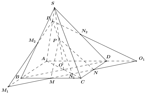 Trong mặt phẳng \(\left( \alpha \right)\), cho hình bình hành \(ABCD\) tâm \(O\), \(S\) là một điểm không thuộc \(\left( \alpha \right)\). Gọi \(M,\,\,N,\,\,P\) lần lượt là trung điểm của \(BC,\,\,CD\) và \(SO\). Đường thẳng \(MN\) cắt \(AB,\,\,AC\) và \(AD\) tại \({M_1},\,\,{N_1}\) và \({O_1}\). Nối \({N_1}P\) cắt \(SA\) tại \({P_1}\), nối \({M_1}{P_1}\) cắt \(SB\) tại \({M_2}\), nối \({O_1}{P_1}\) cắt \(SD\) tại \({N_2}\). Khi đó giao tuyến của \(\left( {MNP} \right)\) với \(\left( {SAB} \right)\) là: