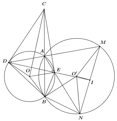 Cho đường trong \(\left( {O;R} \right)\) và đường tròn\(\left( {O';R'} \right)\) cắt nhau tại 2 điểm phân biệt \(A,\,\,B\). Trên tia dối tia \(AB\)lấy điểm \(C\).Kẻ tiếp tuyến \(CD,\,\,CE\) với đường tròn \(\left( {O;R} \right)\), trong đó \(D,\,\,E\) là các tiếp điểm và \(E\) nằm trong đường tròn \(\left( {O';R'} \right)\). Đường thẳng \(AD,\,\,AE\) cắt đường tròn\(\left( {O';R'} \right)\) lần lượt tại \(M\) và \(N\) (\(M,\,\,N\) khác \(A\)). Tia \(DE\) cắt \(MN\)tại \(I\).Chứng minh rằng: