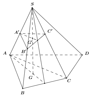 Cho hình chóp \(S.ABCD\). Gọi \(G\) là trọng tâm tam giác \(ABC\). Mặt phẳng \(\left( \alpha \right)\) cắt các tia \(SA,\,\,SB,\,\,SC\) \(SG\) lần lượt tại các điểm \(A',\,\,B',\,\,C',\,\,G'\). Chứng minh rằng \(\dfrac{{SA}}{{SA'}} + \dfrac{{SB}}{{SB'}} + \dfrac{{SC}}{{SC'}} = 3.\dfrac{{SG}}{{SG'}}\).