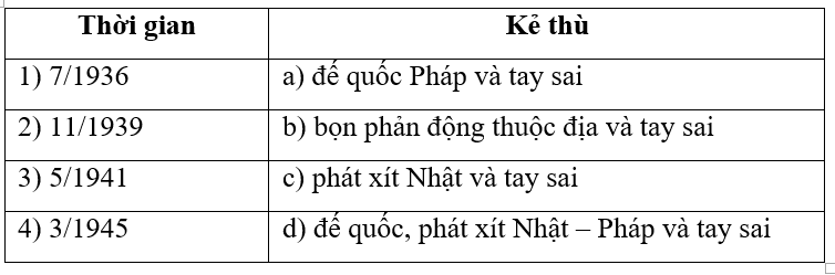 Cho các dữ liệu sau: Nối thời gian với kẻ thù đã được Đảng Cộng sản Đông Dương xác
