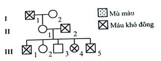 Ở người, bệnh mù màu đỏ - lục và bệnh máu khó đông do hai gen lặn nằm trên nhiễm sắc thể X quy định, cách nhau 15 cM. Theo sơ đồ phả hệ bên, có bao nhiêu phát biểu sau đây đúng?