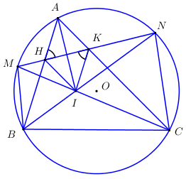 Cho đường tròn tâm \(\left( O \right)\) với dây \(AB\) cố định không phải đường kính. Gọi C là điểm thuộc cung lớn AB sao cho tam giác ABC nhọn. M, N lần lượt là điểm chính giữa của cung nhỏ AB và AC. Gọi I là giao điểm của BN và CM. Gọi I là giao điểm của BN và CM. Dây MN cắt AB và AC lần lượt tại H và K.