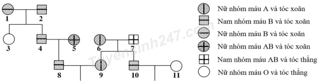 Ở người, gen quy định nhóm máu và gen quy định dạng tóc đều nằm trên nhiễm sắc thể thường và phân li độc lập. Theo dõi sự di truyền của hai gen này ở một dòng họ, người ta vẽ được phả hệ sau:
