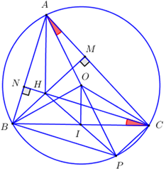 Cho đường tròn tâm \(O\) bán kính \(R = 2019cm,\) có dây \(BC\) cố định \(\left( {BC < 2R} \right),\) \(A\) là một điểm trên cung lớn \(BC\) sao cho tam giác \(ABC\) có ba góc nhọn. Các đường cao \(BM\) và \(CN\) của tam giác \(ABC\) cắt nhau tại \(H\) (với \(M \in AC,\,\,N \in AB\)).