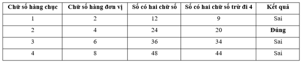 Cho một số có hai chữ số, trong đó chữ số hàng đơn vị gấp đôi chữ số hàng chục. Nếu lấy số đó trừ đi 4 thì sẽ được số có hai chữ số gấp 5 lần chữ số hàng đơn vị. Hãy tìm số đã cho.