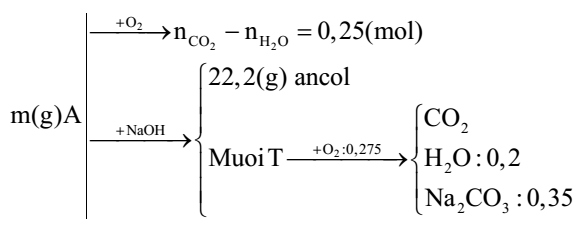 Đốt cháy hoàn toàn m gam hỗn hợp A gồm 3 este X, Y, Z (đều mạch hở và chỉ chứa chức este, Z chiếm phần trăm khối lượng lớn nhất trong A) thu được số mol CO2 lớn hơn số mol H2O là 0,25 mol. Mặt khác, m gam A phản ứng vừa đủ với dung dịch NaOH thu được 22,2 gam hai ancol hơn kém nhau 1 nguyên tử cacbon và hỗn hợp T gồm hai muối. Đốt cháy hoàn toàn T cần vừa đủ 0,275 mol O2, thu được CO2, 0,35 mol Na2CO3 và 0,2 mol H2O. Phần trăm khối lượng của Z trong A là: