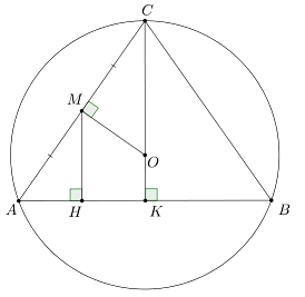 - Kẻ \(CK \bot AB\) tại \(K.\) Tính \(AK\), từ đó chứng minh tam giác \(ABC\) cân tại \(C\) và suy ra \(O \in CK\).