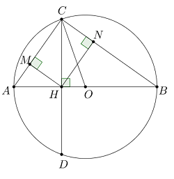 Gọi \(M,\,\,N\) lần lượt là hình chiếu của \(H\) trên \(AC,\,\,BC.\) Tính diện tích tứ giác \(CMHN.\)