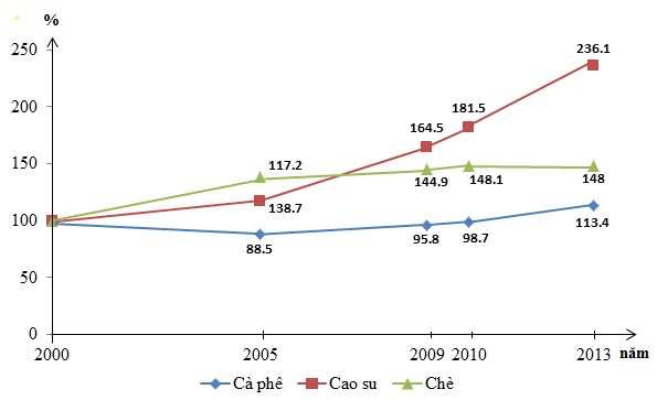 Biểu đồ thể hiện tốc độ tăng trưởng diện tích gieo trồng cà phê, cao su, chè của nước ta, giai đoạn 2000 - 2013