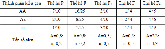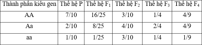 Một loài thực vật, xét 1 gen có 2 alen, alen A trội hoàn toàn so với alen a. Nghiên cứu thành phần kiểu gen của 1 quần thể thuộc loài này qua các thế hệ, thu được kết quả ở bảng sau: