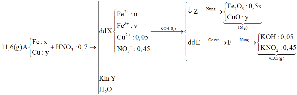Hòa tan hoàn toàn 11,6 gam hỗn hợp Fe và Cu và 700 ml HNO3 1M, thu được dung dịch X và m gam hỗn hợp khí Y (không còn sản phẩm khử khác). Cho 0,5 mol KOH vào dung dịch X thu được kết tủa Z và dung dịch E. Nung kết tủa Z trong không khí đến khối lượng không đổi, thu được 16 gam chất rắn. Cô cạn dung dịch E thu được chất rắn F. Nung chất rắn F đến khối lượng không đổi thu được 41,05 gam chất rắn. Giá trị của m gần nhất với giá trị nào sau đây?