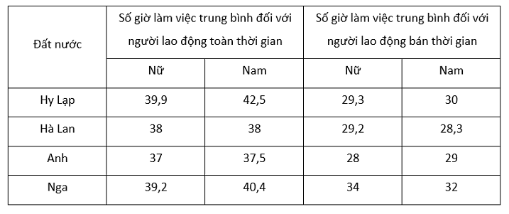 - Đọc số giờ làm việc trung bình của nữ lao động toàn thời gian tại Hà Lan; tại 3 quốc gia còn lại và tính tổng của cả 4 quốc gia.