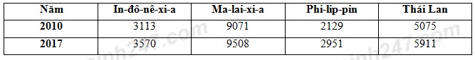 Theo bảng số liệu, nhận xét nào sau đây đúng khi so sánh tổng sản phẩm trong nước bình quân đầu người của một số quốc gia Đông Nam Á năm 2017 so với năm 2010?