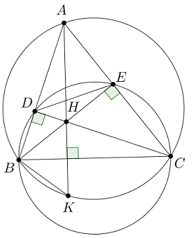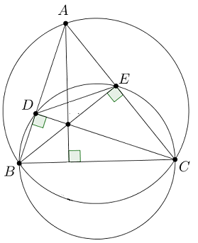 Cho tam giác \(ABC\). Đường tròn đường kính \(BC\) cắt \(AB,AC\) tại \(D,E.\)