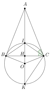 Cho tam giác \(ABC\) cân tại \(A,\,\,I\) là giao điểm các đường phân giác. Gọi \(H\) là trung điểm \(BC,\,\,IK\) là đường kính của đường tròn \(\left( O \right)\) ngoại tiếp tam giác \(BIC.\) Chứng minh rằng \(\dfrac{{AI}}{{AK}} = \dfrac{{HI}}{{HK}}.\)