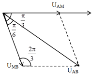Đặt điện áp xoay chiều có giá trị hiệu dụng 220 V vào hai đầu đoạn mạch AB như hình bên. Biết điện áp tức thời uAM và uMB lệch pha nhau \(\dfrac{\pi }{3}\), điện áp tức thời uAB và uMB lệch pha nhau \(\dfrac{\pi }{6}.\) Điện áp hiệu dụng hai đầu đoạn mạch AM là