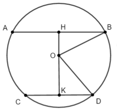- Kẻ \(OH \bot AB,\,\,\,OK \bot CD\)\(\left( {H \in AB;\,\,K \in CD} \right).\)