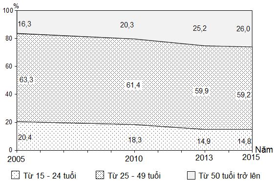 Cho biểu đồ: CƠ CẤU LAO ĐỘNG TỪ 15 TUỔI TRỞ LÊN PHÂN THEO NHÓM TUỔI Ở NƯỚC TA, GIAI ĐOẠN