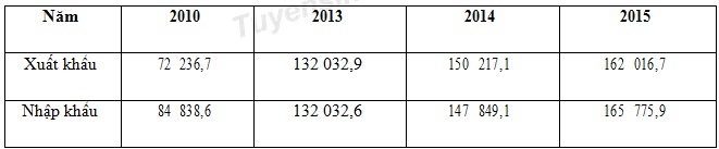 Cho bảng số liệu: GIÁ TRỊ XUẤT, NHẬP KHẨU CỦA NƯỚC TA, GIAI ĐOẠN 2010 - 2015 (Đơn vị: