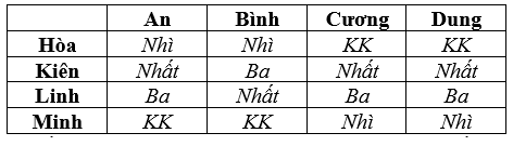 - Dựa vào giả thiết, lập bảng các giải mà các bạn An, Bình, Cương, Dung có thể nhận được theo lời nói của các bạn Hòa, Kiên, Linh, Minh.