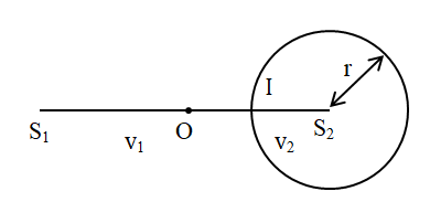 Hai nguồn kết hợp S1, S2 cách nhau một khoảng \({S_1}{S_2} = 2d\) có tần số f = 50 Hz gây ra sóng trên mặt nước trong một chậu lớn. Người ta đặt một cái đĩa nhựa tròn bán kính r = 1,2 cm lên đáy nằm ngang của chậu, tâm đĩa là S2. Tốc độ truyền sóng ở chỗ nước sâu là \({v_1} = 0,5\,\,m/s\). Ở chỗ nước nông hơn vì có đĩa, tốc độ tuyền sóng là \({v_2} < {v_1}\). Tím giá trị lớn nhất của v2 gần giá trị nào nhất sau đây, biết trung điểm của S1S2 là một đường nút (biên độ dao động cực tiểu) và \(r < d\)