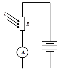 Trên hình vẽ, bộ pin có suất điện động 9V, điện trở trong 1Ω; A là ampe kế hoặc miliampe kế có điện trở rất nhỏ; R là quang điện trở (khi chưa chiếu sáng giá trị là R1 và khi chiếu sáng giá trị là R2) và L là chùm sáng chiếu vào quang điện trở. Khi không chiếu sáng vào quang điện trở thì số chỉ của miliampe kế là \(6\,\,\mu A\) và khi chiếu sáng thì số chỉ của ampe kế là 0,6A.