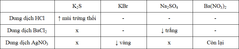 Trình bày phương pháp hóa học phân biệt các dung dịch trong các lọ mất nhãn sau (viết các phương trình hóa học đã xảy ra): K2S, Na2SO4, KBr, Ba(NO3)2.