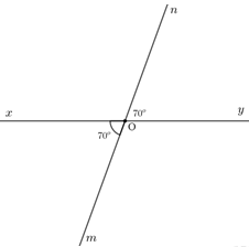 Cho hai tia \({\rm{Ox}}\), \(Oy\) đối nhau. Trên hai nửa mặt phẳng đối nhau có bờ chứa tia \({\rm{Ox,}}\) vẽ các tia \(Om,\)\(On\) sao cho \(\angle xOm = {70^o},\,\angle yOn = {70^o}.\) Chứng tỏ rằng \(Om\), \(On\) là hai tia đối nhau.