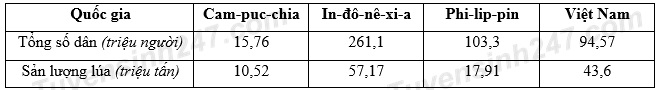 Qua bảng số liệu về dân số và sản lượng lúa một số quốc gia ở Đông Nam Á năm