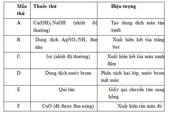 Biết rằng 6 mẫu chất đã dùng để thí nghiệm bao gồm: rượu etylic, axit axetic, benzen, hồ tinh bột, dung dịch glucozo và lòng trắng trứng. Dựa trên kết quả thí nghiệm, hãy cho biết mẫu thử A, B, C, D, E, E tương ứng với mẫu chất nào trong 6 mẫu chất đã cho