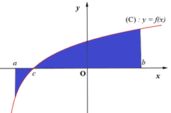 Cho hàm số \(y = f\left( x \right)\) liên tục trên đoạn \(\left[ {a;b} \right]\). Diện tích của hình phẳng được giới hạn bởi đồ thị hàm số \(y = f\left( x \right)\), trục hoành và hai đường thẳng \(x = a\), \(x = b\,\,\)\(\left( {a < b} \right)\) (phần đồ thị trong hình vẽ bên) theo công thức nào dưới đây?
