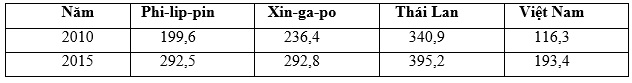 Tổng sản phẩm trong nước của một số quốc gia khu vực Đông Nam Á, năm 2010 và năm 2015(Đơn vị: Tỷ đô la Mỹ)