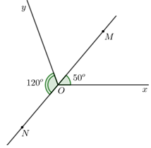 Cho góc \(xOy\) có số đo là \({110^0}\). Lấy điểm \(M\) ở trong góc \(xOy\) sao cho \(\angle xOM = {50^o}\). Trên nửa mặt phẳng bờ chứa tia \(Oy\) mà không có điểm \(M\) lấy điểm \(N\) sao cho \(\angle yON = {120^0}\). Chứng tỏ rằng ba điểm \(M,\,\,O,\,\,N\) thẳng hàng.