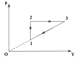 Đường biểu diễn quá trình biến đổi trạng thái của một mol khí lí tưởng trong hệ tọa độ (p,V) như hình vẽ. Nhiệt độ ở trạng thái 1 và trạng thái 3 là T1 = 350K và T3 = 450K. Tìm nhiệt độ ở trạng thái 2?