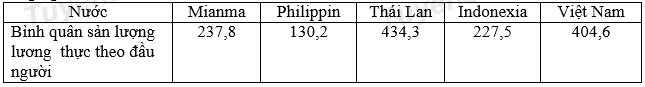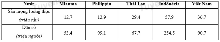 Cho bảng số liệu: Sản lượng lương thực và dân số của một số quốc gia ở khu vực Đông