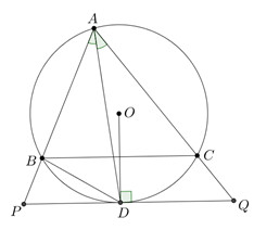 Cho tam giác \(ABC\) nội tiếp đường tròn \(\left( O \right).\) Phân giác góc \(A\) cắt \(\left( O \right)\) tại \(D.\) Gọi \(P,\,\,Q\) lần lượt là giao điểm của \(AB,\,\,AC\) với tiếp tuyến tại \(D\) của \(\left( O \right).\) Chứng minh rằng \(BC\parallel PQ\).
