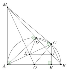 Cho nửa đường tròn tâm \(O\) đường kính \(AB,\) trên nửa mặt phẳng chứa nửa đường thẳng có bờ là đường thẳng \(AB\), kẻ tia \(Ax \bot AB.\) Lấy diểm \(M\) trên tia \(Ax,\) kẻ tiếp tuyến \(MC.\) Gọi \(D\) là giao điểm của \(MB\) và nửa đường tròn, \(E\) là giao điểm của \(OM\) và \(AC.\) Kẻ \(CH \bot AB,\) gọi \(I\) là giao điểm của \(MB\) và \(CH.\) Chứng minh rằng \(EI \bot AM.\)