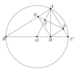Cho đường tròn \(\left( O \right)\) đường kính \(BC.\) Trên đường tròn lấy điểm \(A\) sao cho \(AB > AC.\) Kẻ \(AH \bot BC,\) \(HE \bot AB,\,\) \(HF \bot AC.\) Chứng minh rằng \(EF \bot OA.\)
