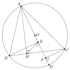 Cho tam giác \(ABC\) nhọn, nội tiếp \(\left( O \right)\) và \(AB < AC.\) Vẽ đường kính \(AD\). Kẻ \(BE,CF\) vuông góc với \(AD\,\,\left( {E,F \in AD} \right)\). Kẻ \(AH \bot BC\,\,\left( {H \in BC} \right).\)