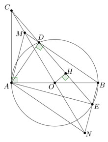 Cho đường tròn tâm \(\left( O \right)\) đường kính \(AB.\) Kẻ tiếp tuyến \(Ax.\) Trên tia \(Ax\) lấy \(C,\) từ \(C\) kẻ đường thẳng cắt đường tròn \(\left( O \right)\) tại \(D,E\) (\(D,E\) không cùng nửa mặt phẳng bờ \(AB,\) \(D\) nằm giữa \(C\) và \(E\)). Từ \(O\) kẻ \(OH \bot DE.\)