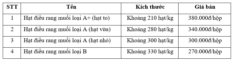 Dưới đây là bảng giá hạt điều rang muối bán lẻ, giá chưa bao gồm thuế VAT, quy cách đóng hộp tròn 500gr.