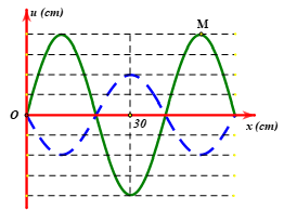 Một sợi dây đàn hồi căng ngang hai đầu cố định AB đang có sóng dừng ổn định với tần số f. Hình vẽ mô tả dạng của sợi dây tại thời điểm t1 (nét liền) và thời điểm \({t_2} = {t_1} + \dfrac{2}{3}\,\,s\) (nét đứt). Biết rằng thời điểm t1, điểm M có tốc độ bằng 0 và hướng về vị trí cân bằng của nó. Tốc độ truyền sóng trên dây có thể là